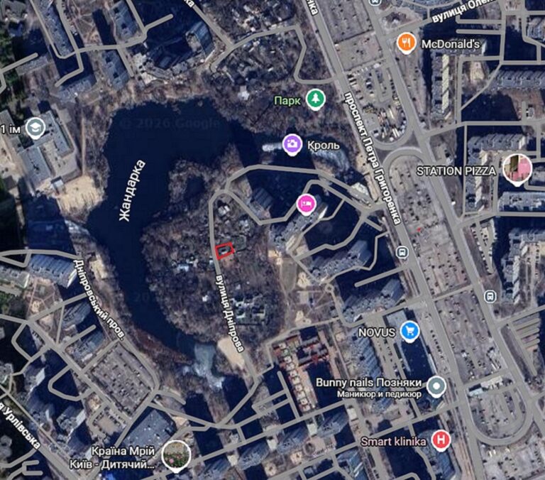Земельна ділянка розташована у приватній забудові біля озера Жандарка. Локація унікальна тим, що поєднує міську інфроструктуру та природні зони відпочинку. За сотню метрів озеро з пляжем, парк. Водночас поряд вся міська інфроструктура: школи, гімназії, садки, медичні та адміністративні установи, супермаркети, кафе, ресторани, спортивні клуби та зали. Зручний виїзд на вулицю Урловську та проспект Григоренка, метро Позняки.